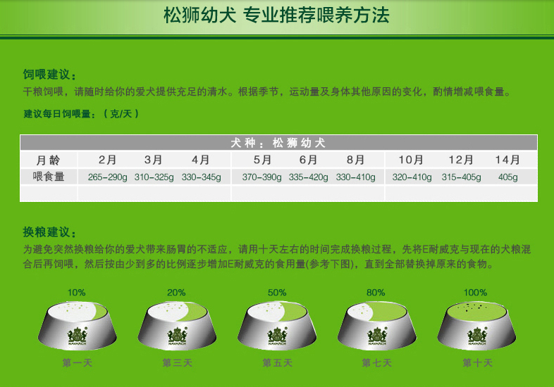 干糧飼喂,請(qǐng)隨時(shí)給您的愛犬提供充足的清水。根據(jù)季節(jié)、運(yùn)動(dòng)量及身體其他原因的變化,酌情增減喂食量。